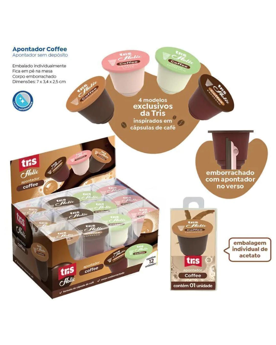 O apontador Coffee é inspirado em cápsulas de café, possui corpo emborrachado e fica em pé na mesa. Vem embalado individualmente e em 4 cores!