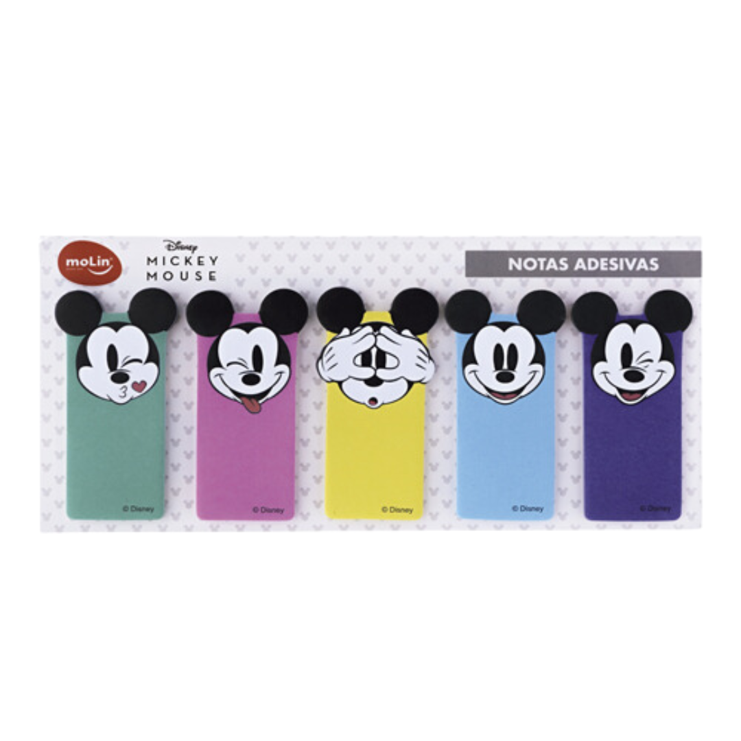 São cinco blocos de notas adesivas com várias carinhas fofas do Mickey com 25 folhas cada.