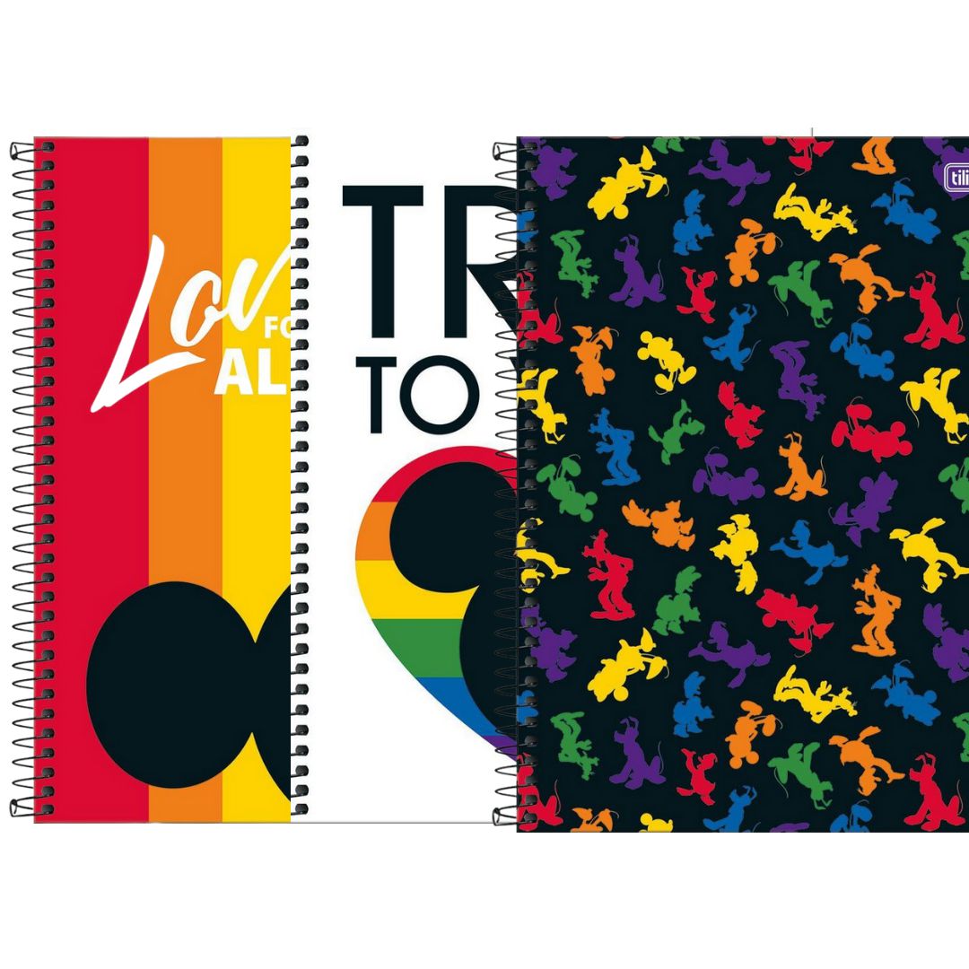 Caderno Mickey Mouse universitário com folhas pautadas, bem destacáveis e folhas adesivas. O caderno possui dois modelos de capa disponível em nosso site.