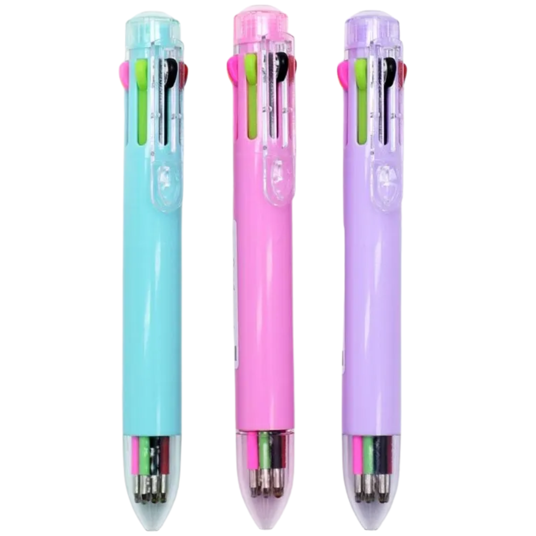 Caneta esferográfica com design moderno e divertido, perfeita para quem gosta de praticidade e estilo. Reunindo oito cores vibrantes em um único corpo: rosa, verde, laranja, roxo, ciano, azul marinho, vermelho e preto, oferecendo versatilidade para anotações, desenhos, planners e outros projetos criativos.