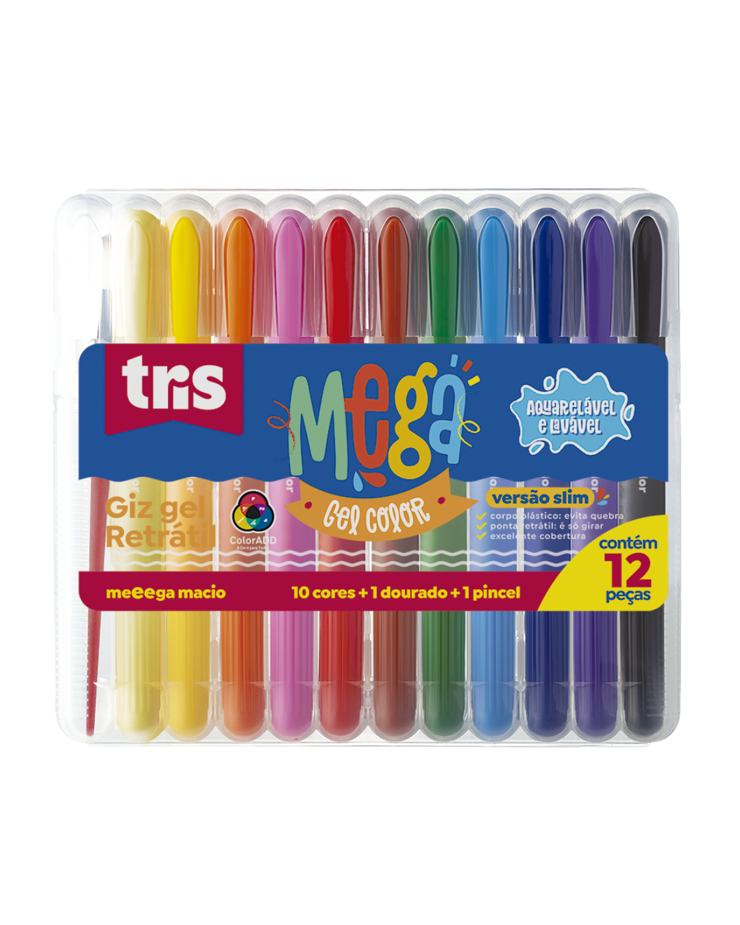MEGA divertido! MEGA colorido! A linha de colorir MEGA da TRIS é uma alternativa de qualidade para potencializar a criatividade dos seus usuários. Cores super vibrantes e textura inigualável! O giz retrátil slim MEGA Gel Color tem uma excelente cobertura de cor e é aquarelável. É ideal p ara pré-escola e vem com cheirinhos que despertam ainda mais os sentidos e a curiosidade dos pequenos artistas. São 10 gizes com cores regulares e 1 dourado! Acompanha pincel! Os gizes possuem o nome das cores e código ColorADD no corpo. A ColorADD é uma linguagem universal que ajuda daltônicos a identificar cores. Com símbolos representando cada cor, a paleta se torna acessível aos daltônicos, trazendo mais cor à vida das pessoas.