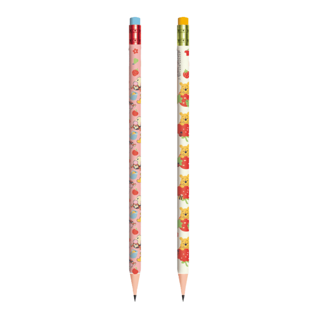 Lápis Preto HB de resina com estampas diferentes, exibindo o Ursinho Pooh e seus amigos, de maneira colorida e divertida! É confortável para escrever e desenhar, o lápis vem com virola e borracha em resina plástica na ponta, ambas coloridas, prática para apagar o que for preciso.