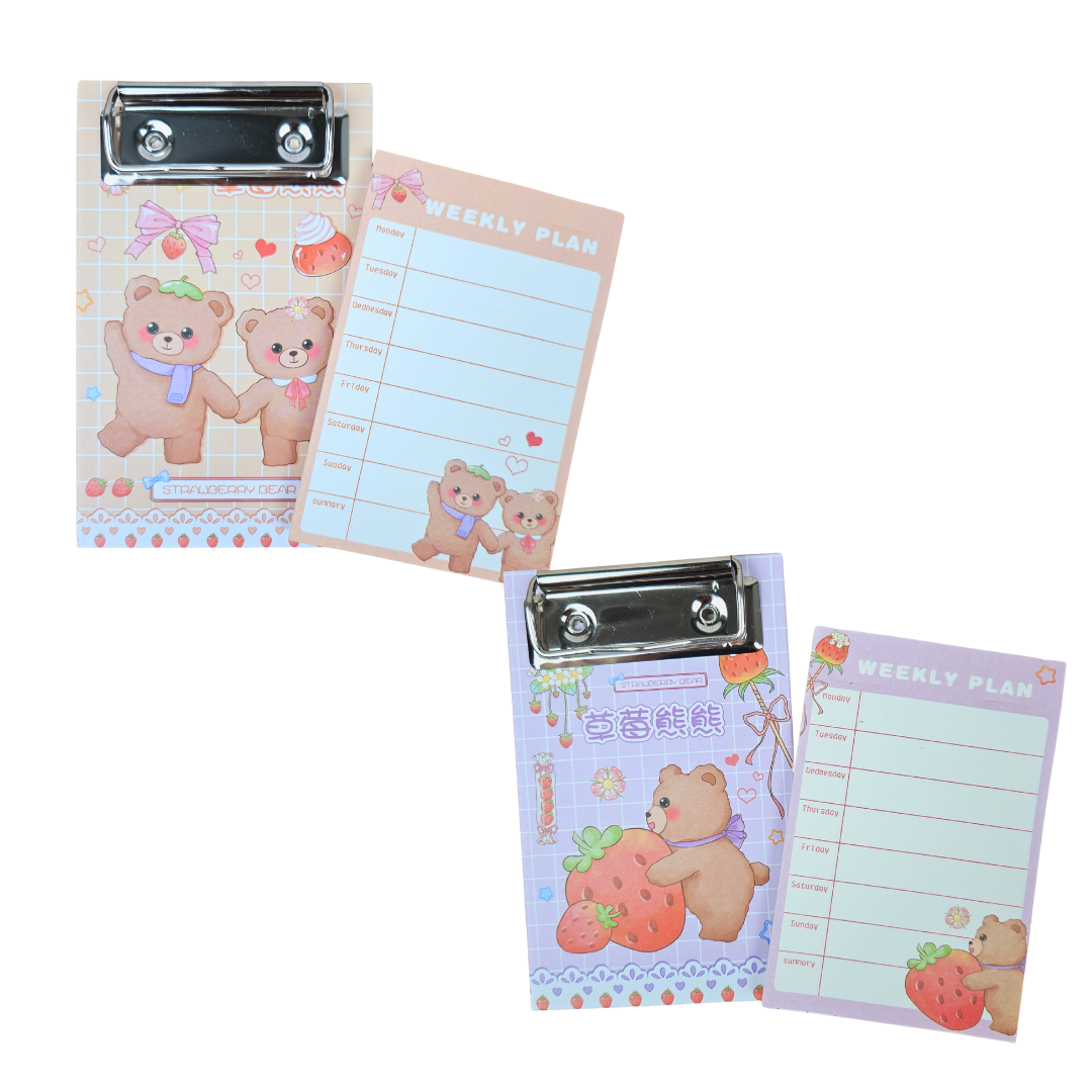 Prancheta fofa temática de urso com bloquinho de planner semanal. As páginas são decoradas e coloridas super fofas, e as pranchetas também!!